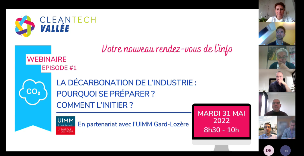Un webinaire organisé en partenariat avec l’UIMM Gard Lozère, durant lequel son Président Philippe Patitucci et Virginie Monnier-Mangue, Présidente de la CleanTech Vallée ont rappelé l’importance de s’informer, se former et s’engager dans une démarche de décarbonation dès aujourd’hui pour avoir des résultats dans les années à venir.